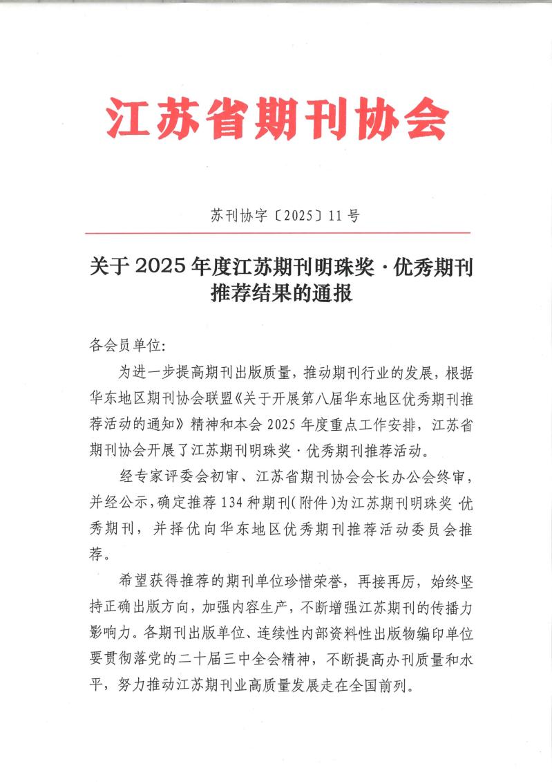 10月24日,省期刊协会公布《关于2025年度江苏期刊明珠奖·优秀期刊推荐结果的通报》,我刊被评为江苏期刊明珠奖·优秀期刊。