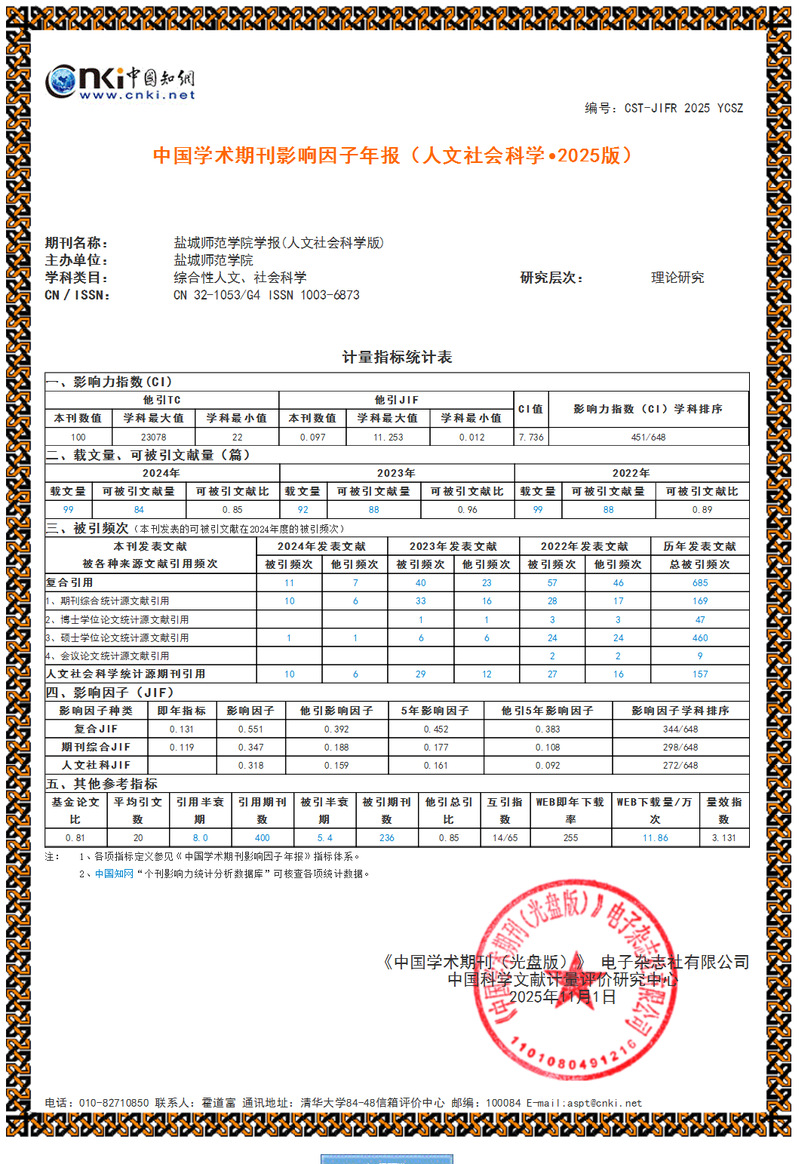 近日,中国知网发布《中国学术期刊影响因子年报(人文社会科学·2025版)》,2025年《盐城师范学院学报(人文社会科学版)》继续被列为统计刊源,复合影响因子为0.551,比去年提升幅度达48.52%,综合影响因子0.347,比去年提升幅度达55.6%,影响力指数学科排序451,比去年提升43个位次,至此,学报影响因子连续五年实现攀升。